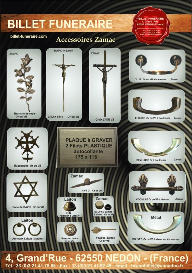 Nous mettons en vente toute une gamme d’accessoires et d’ornements de cercueils : des plaques funéraires, des emblèmes religieux ou non, des cache-vis, des anneaux, des poignées, etc.